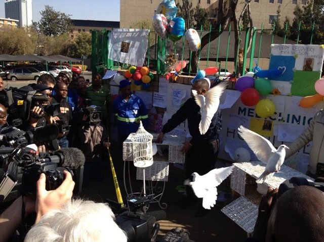 Інші мешканці країни випустили біля лікарні голубів. Громадяни кажуть, що Мандела звільнив країну від політики апартеїду - голуби, випущені на волю, символізують це звільнення.