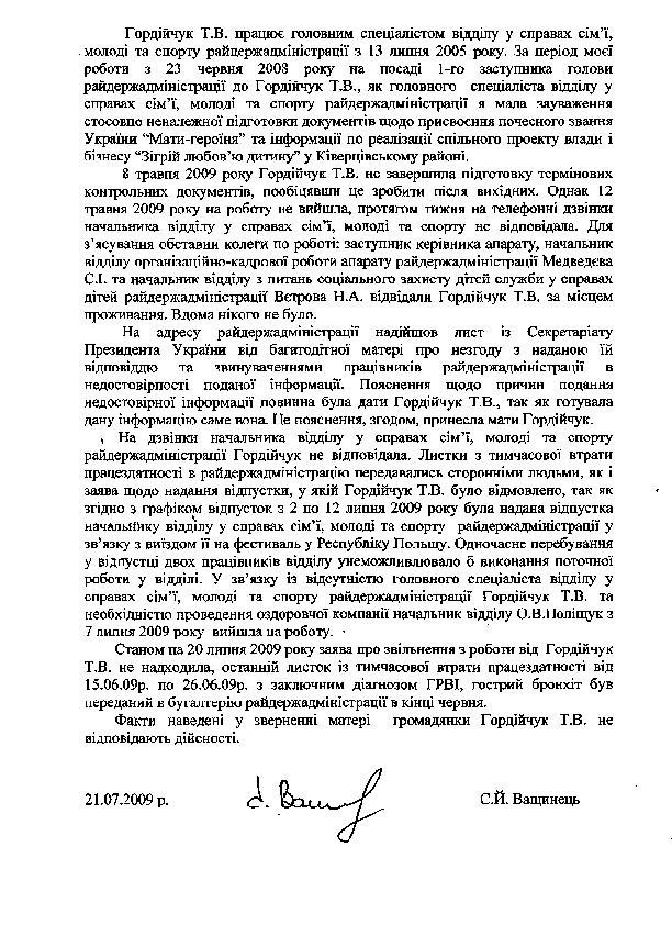 У листі йдеться, що на дзвінки начальника відділу у справах сім’ї, молоді та спорту РДА Гордійчук буцімто не відповідала. «Листки з тимчасової втрати працездатності в райдержадміністрацію передавались сторонніми людьми, як і заява щодо надання відпустки, у якій Гордійчук Т.В. було відмовлено, так як згідно з графіком відпусток із 2 по 12 липня 2009 року була надана відпустка начальнику відділу у справах сім’ї, молоді та спорту райдержадміністрації у зв’язку з виїздом її на фестиваль у Республіку Польщу», – пише Світлана Ващинець.
