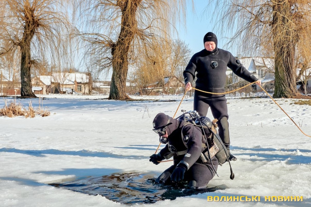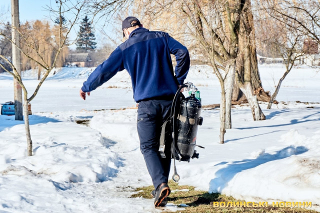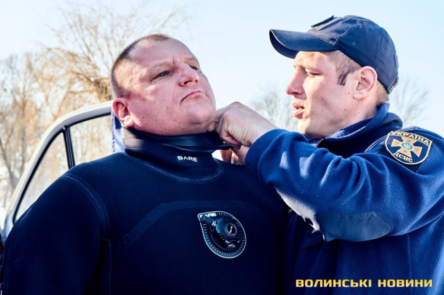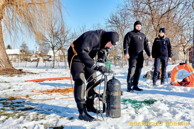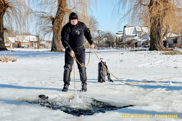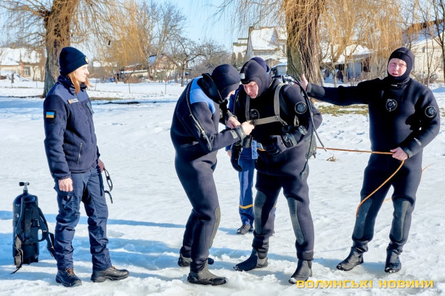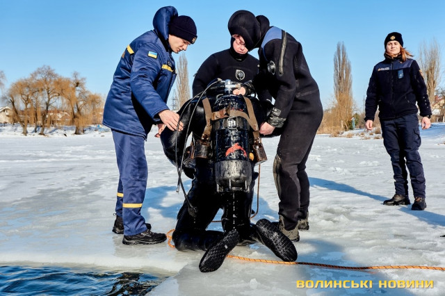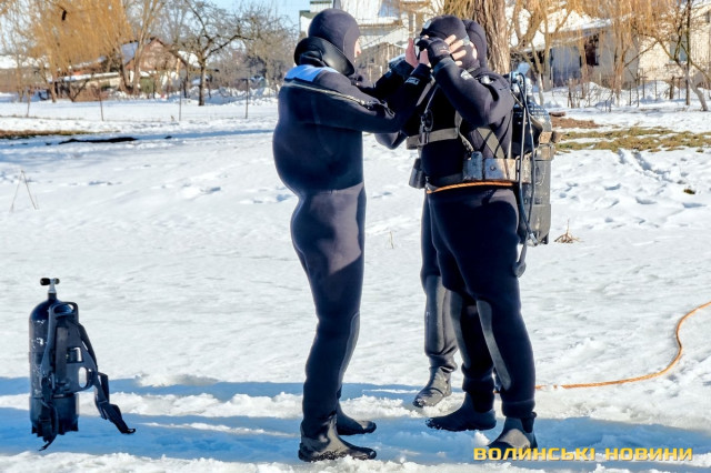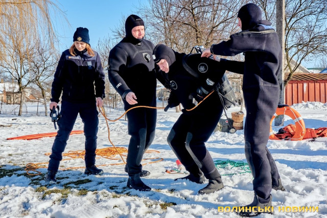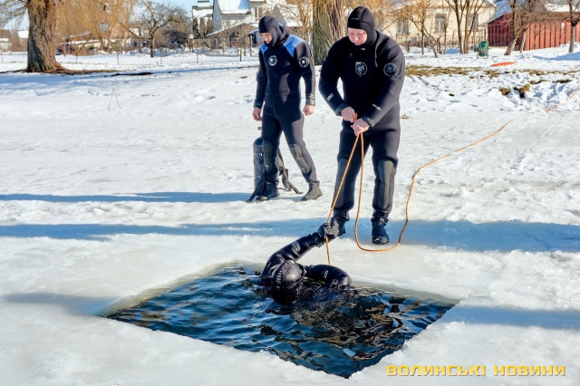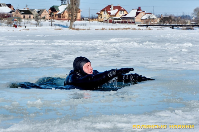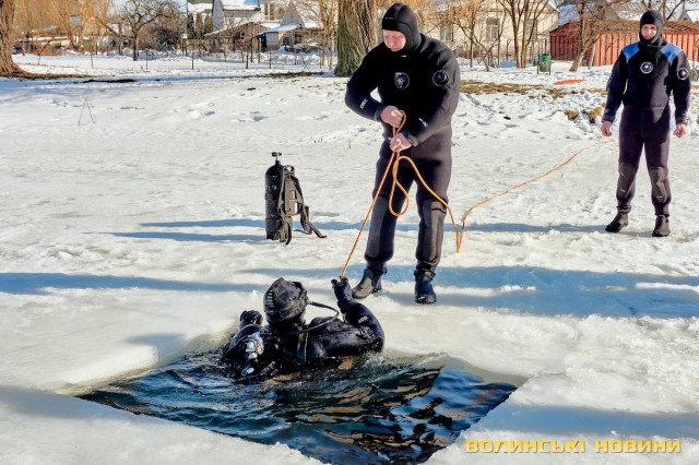 Волинські водолази мають допуски до роботи на глибині до 20 метрів, адже на Волині немає водойм, які мають більшу глибину. Зазвичай це максимум 10-12 метрів. Але і це – величезне навантаження на організм і для роботи треба мати хорошу фізичну форму.Цього разу водолази відпрацьовували занурення під лід. Для цього вирізали спеціальну ополонку, куди і має зануритись службовець у гідрокостюмі. Сам костюм пристосований до роботи в таких умовах і витримує низькі температури. Але ще є спорядження, яке важить чимало: близько 35 кілограмів. Це і балон з повітрям, і вантаж для занурення.