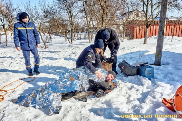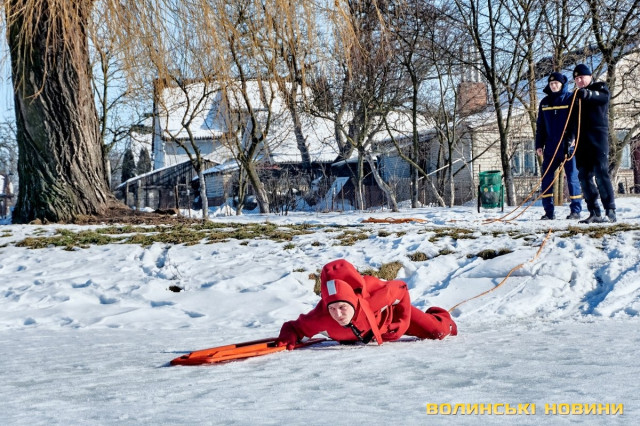 «Якщо людина провалилася, в першу чергу треба зберігати спокій, подивитися в різні боки, чи є поряд люди, покликати на допомогу. Треба намагатися повним тілом вилізти на кригу і повертатися до берега тими слідами, якими прийшли, так будете впевнені, що в цьому місці лід твердий і є більша ймовірність вибратися самостійно», – нагадує керівник групи.Водолаз Василь Фрідріх у складі рятувального загону уже три роки. Зараз його завдання – максимально швидко врятувати чоловіка, який упав в ополонку. В спеціальному костюмі, який призначений саме для таких робіт, а не для занурення, він має подати тому, хто тоне, рятувальні сани. Інші рятувальники, які перебувають на березі, мають їх витягнути. Згодом, уже на березі, врятованому надають першу допомогу, закутують термоковдрою, оглядають на наявність травм, поять гарячим чаєм з термоса.Загалом рятувальна операція тривала лічені хвилини. Це цього разу надворі було +3 й світило сонце. Але подібні тренування відбувалися у рятувальників і в екстремальніших умовах, коли були великі морози, адже треба бути готовими до будь-яких умов.