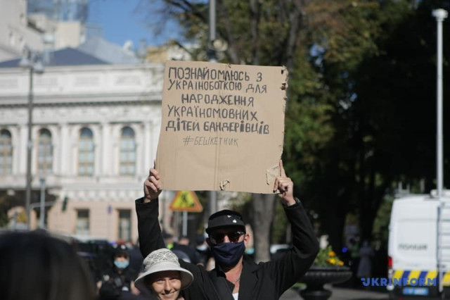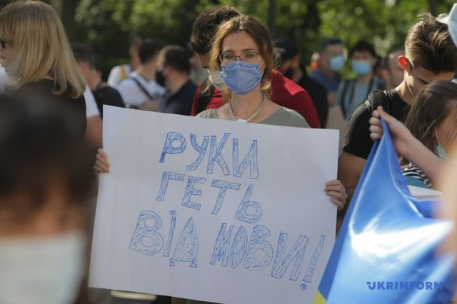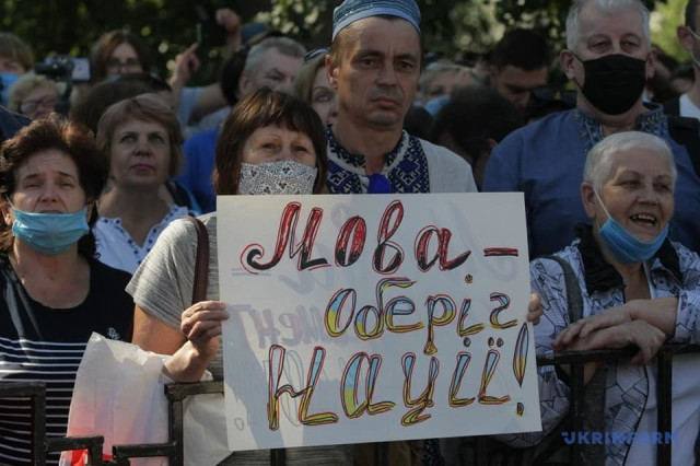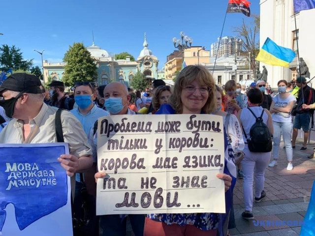 Під Верховною Радою проходить мітинг проти скандального «мовного» законопроєкту нардепа від Слуги народу Максима Бужанського про повернення російської мови в шкільний освітній процес.