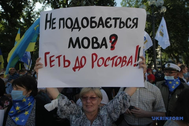 Біля будівлі парламенту зібралися сотні активістів. Вони тримають плакати Мова — це зброя, Руки геть від мови, Кажи мовою, а не ляпай язиком та Заважає мова — геть до Ростова.