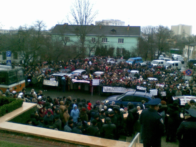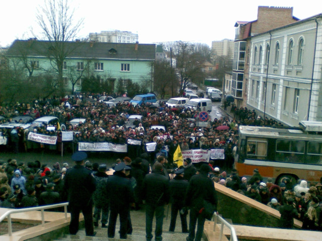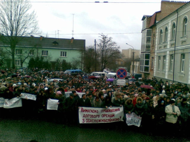 Власне, під стінами міськради зібралaся приблизно тисяча протестувальників, які тримають у руках транспаранти з вимогами продовжити оренду «Облспоживспілці».