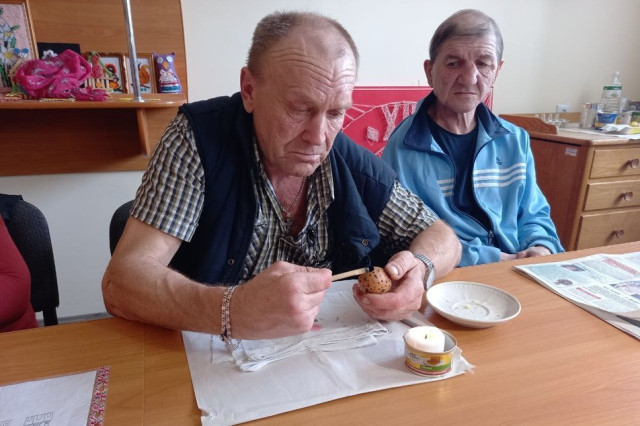 Мешканець пансіонату, волинянин із хутора Кумовище Луцького району Віталій Сасюк розповів, що його двоє синів та племінник зараз служать у Збройних силах України. Чоловік постійно долучається до усіх майстерок та разом із усіма волонтерить, щоб допомогти армії.«Цікаво, як воно все робиться, відразу я не думав, що можу зробити, знав що люди роблять його. Ми вже і сітки плели на схід, і свічки робили окопні, і ще, може, будемо робити, горіхи б’ємо», – додав Віталій Сасюк.Із писанок, які розписують мешканці закладу, згодом зроблять великодній декор, яким прикрасять пансіонат.