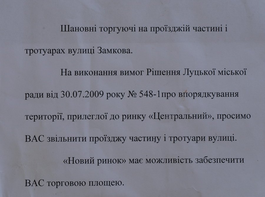 Для тих, хто все ж таки не покинув вулицю Замкову, а це переважно продавці кавунів, кожних три хвилини лунає оголошення: «Шановні торгуючі на проїжджій частині і тротуарах вулиці Замкова! На виконання вимог рішення Луцької міської ради від 03.07.2009 року про впорядкування території, прилеглої до ринку «Центральний», просимо вас звільнити проїжджу частину і тротуар вулиці. «Новий ринок» має можливість забезпечити вас торговою площею».