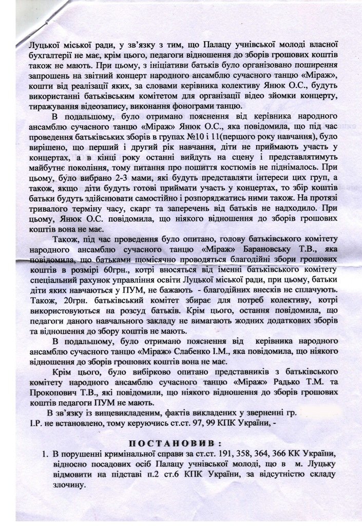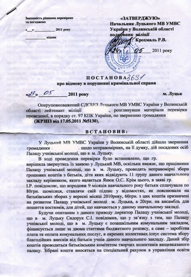 Міліція опитала директора Палацу учнівської молоді Степана Сидорука, керівника ансамблю Оксану Янюк, голову батьківського комітету ансамблю Тетяну Барановську. Оскільки усі в один голос стверджували, що працівники палацу жодного стосунку до збору грошей не мають, а гроші збираються батьківським комітетом і зберігаються на спеціальному рахунку – складу злочину міліція не побачила.