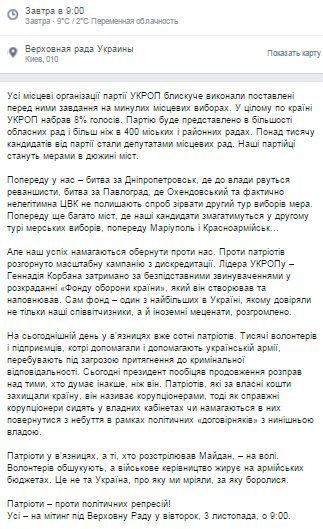 Окрім цього, як стало відомо, «Українське об’єднання патріотів – УКРОП» закликає патріотів з усієї України 3 листопада о 9:00 зібратися на мітинг під Верховною Радою у Києві на знак протесту проти політичних репресій, за звільнення політв’язнів та на захист результатів місцевих виборів.