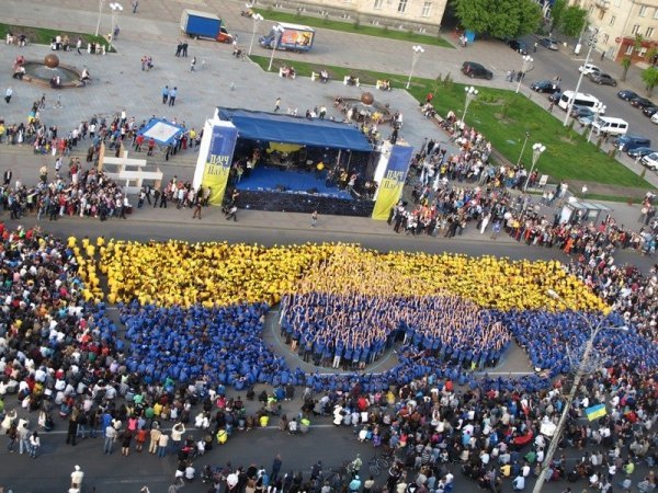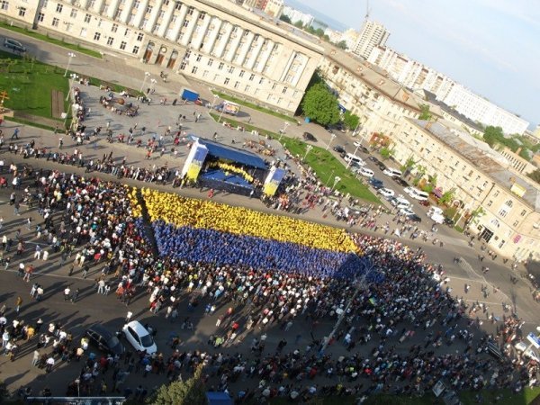 Після колективного присідання черкащани, які були вдягнені у футболки під колір прапора – синьо-жовті – посеред площі зобразили серце, що пульсує.