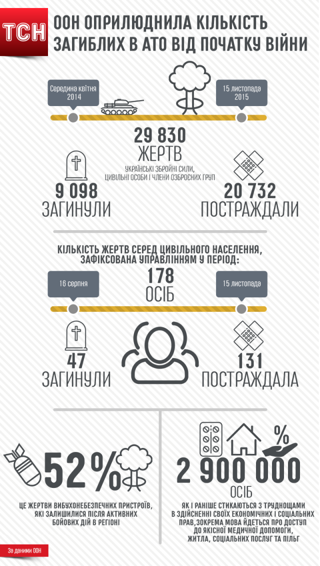 «У цілому з середини квітня 2014 по 15 листопада 2015 зафіксовано як мінімум 29830 жертв (українські Збройні сили, цивільні особи і члени озброєних груп) в районі збройного конфлікту на сході України, в тому числі, як мінімум, 9098 загинули, щонайменше 20732 постраждали», – говориться в доповіді.