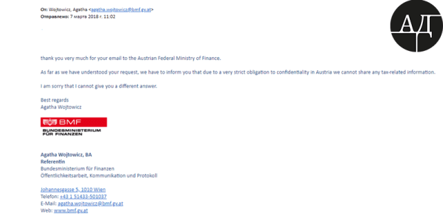 Журналіст звернувся в Мінфін Австрії, корпорацію Roshen, а також до російських контрагентів партнера президента пана Зайцева. У своїх запитах він попросив прокоментувати фінансові документи і повідомити про зміст контрактів між JB Park і КАМАЗ, і JB Park і Новошахтинський НПЗ. І не отримав жодного спростування наведеної інформації.