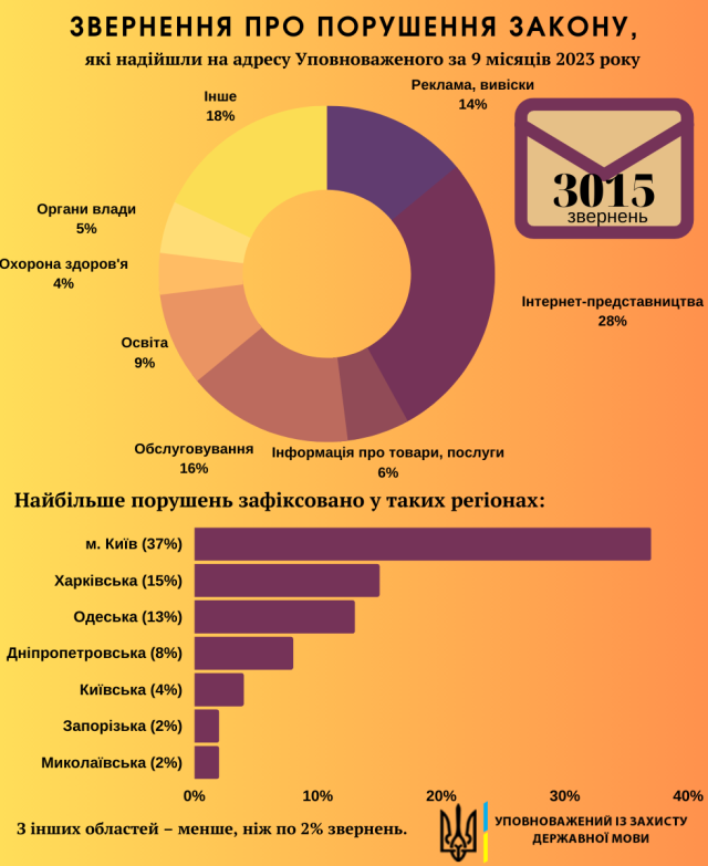 За дев’ять місяців 2023 року на адресу Уповноваженого із захисту державної мови надійшло 3015 звернень громадян про порушення Закону України «Про забезпечення функціонування української мови як державної».