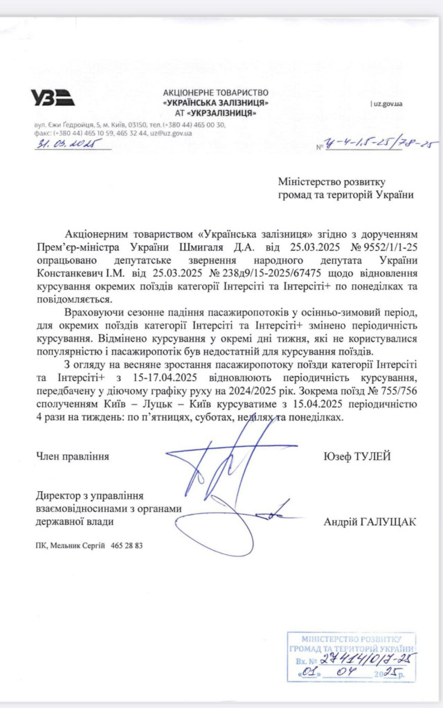 У зв'язку зі збільшенням пасажиропотоку потяг Інтерсіті сполученням Луцьк – Київ курсуватиме частіше.
