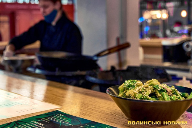 «Тут на 19 квадратах ми готуємо дві повноцінні кухні з двома повноцінними меню, починаючи від закусок, салатів та перших страв і закінчуючи десертами, – розповідає шеф-кухар, готуючи нам Пад Пак Бунг – теплий салат із міксу зелених овочів вок з устрично-соєвим соусом. – Головне – все правильно адаптувати, щоб усе було функціональне і під рукою».