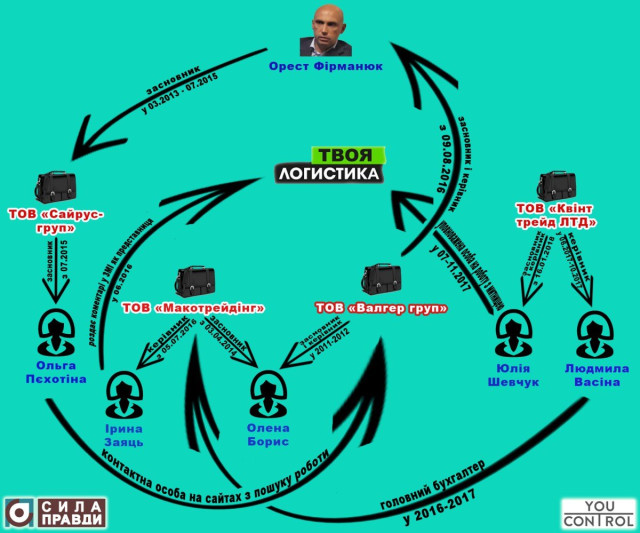 За даними аналітичної системи «Youcontrol» компанію «Сайрус-груп» створив у 2012-му мешканець Кіровограда Андрій Фрунза. Однак, вже у 2013 компанію переписали на самого Ореста Фірманюка. Напередодні конкурсу з оренди приміщень на Волинській митниці свою фірму Фірманюк переписав на співробітницю «Твоєї логістики» Ольгу Пєхотіну. Вона ж на сайтах із пошуку роботи вказана як контактна особа ще однієї брокерської компанії «Валгер Груп», засновником якої наразі і є Орест Фірманюк. У 2011-2012 роках засновницею цієї компанії була інша особа – Олена Борис.