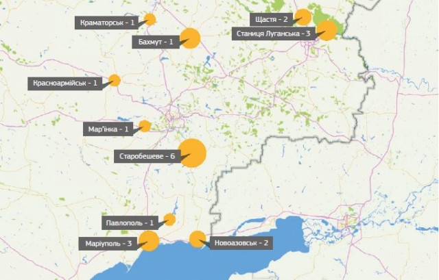 За його словами, свідчення потерпілих, зібрані авторами в ході окремих моніторингових візитів з різних джерел, дозволяють зробити висновок про поширену практику затримань місцевого населення Донецької і Луганської областей за підозрою в "сепаратизмі". "Йдеться, переважно, про факти затримання в 2014-2015 роках, але самі показання нам вдалося взяти набагато пізніше, тому що люди досі налякані і не хотіли говорити про те, що пережили", - розповідає Андрій Гладун.На карті вказано кількість осіб, інформація про яких була зібрана для звіту за приблизними місцем затримання. Фото: УГГ