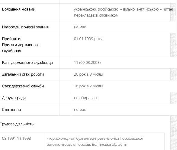 По морді лиця зразу щось подумав що людина не привітна і хамло. Далі почав читати біографію і побачив місце роботи - відділ державної виконавчої служби. Переконався у своїх домислах остаточно. Можливо у виконавчій службі і є справжні професіонали, виховані і привітні люди, але такі там на довго не затримуються. А тут аж 16 років... Хто був у виконавчій службі (не важливо в якому районі чи місті, підхід до простих людей всерівно ідентичний скрізь), той зі мною погодиться.