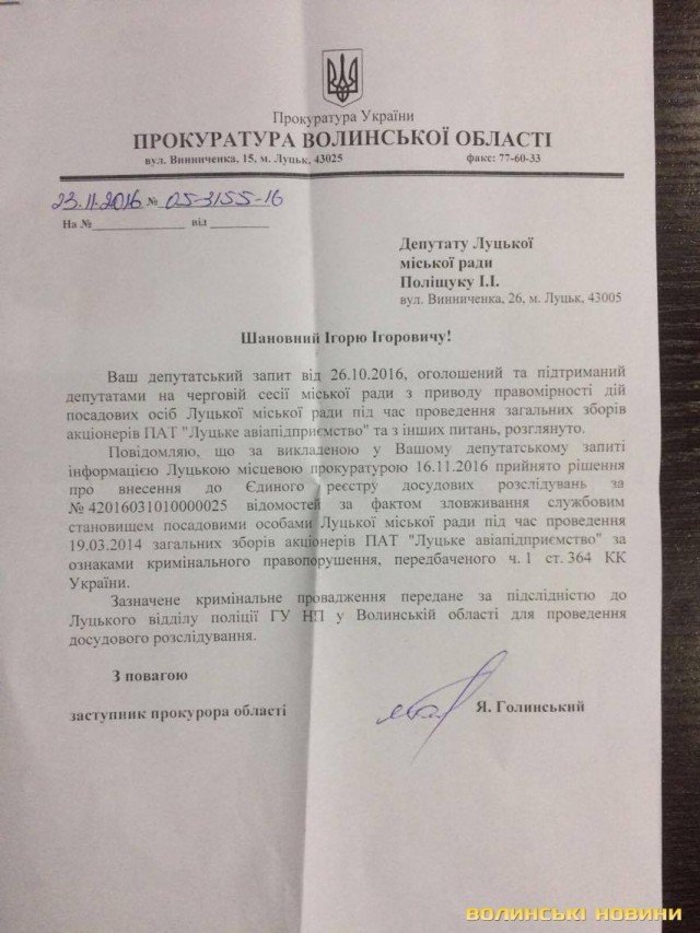 «Міський голова Микола Романюк як заслужений економіст України не міг не знати, до яких наслідків призводить додаткове розміщення акцій з подальшою відмовою від їх придбання. Прошу прокурора провести повну та об’єктивну перевірку на предмет вчинення посадовими особами Луцької міської ради та Луцьким міським головою дій в інтересах третіх осіб під час голосування 19.03.2014 року на загальних зборах ПАТ «Луцьке авіапідприємство», - звернувся депутат Ігор Поліщук.