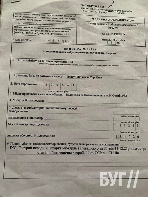 У жительки села Морозовичі Поромівської громади 57-річної Людмили Плясун стався гострий передній інфаркт міокарда, після якого жінку скерували у Волинську обласну клінічну лікарню, де їй призначили операцію на серці, вартість якої складатиме від 70000 гривень.