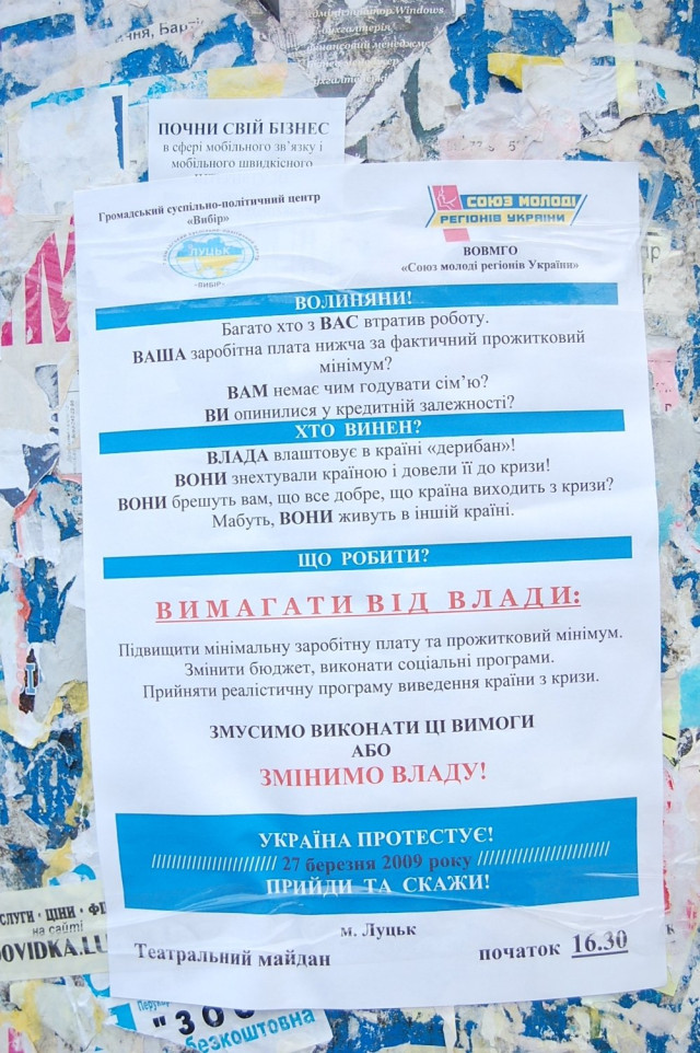 У Луцьку відбувся мітинг протесту «Будь громадянином! Скажи своє слово!», заявленими організаторами якого виступили Громадський суспільно-політичний центр «Вибір» та Волинське обласне відділення молодіжної громадської організації «Союз молоді регіонів України». Про це 28 березня повідомляє репортер «Волинських Новин».