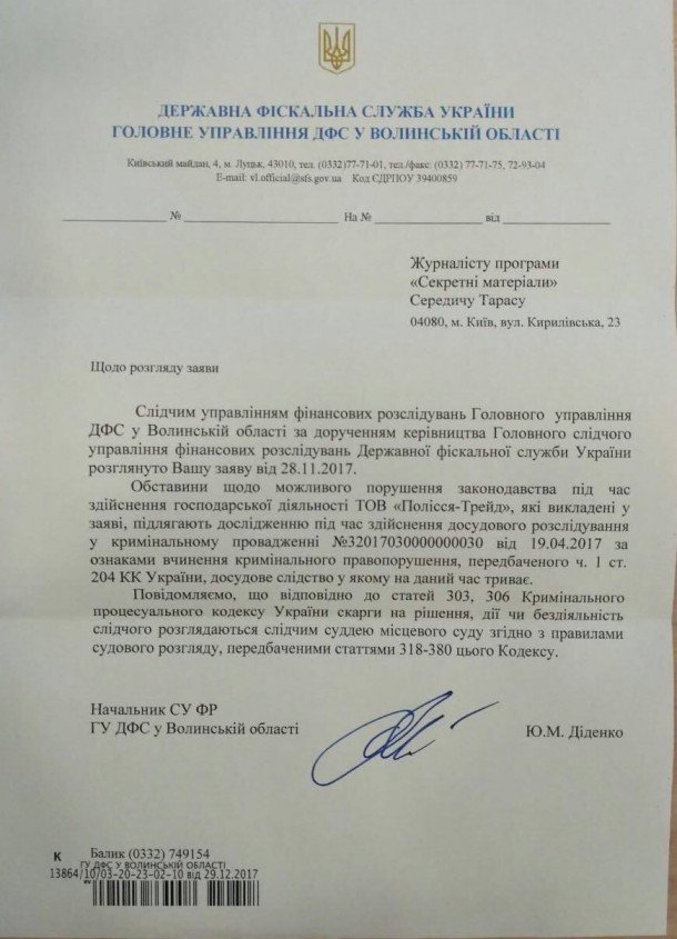 Матеріалом-викриттям бізнеса Петра Нестерука, опублікованих у ЗМІ, зацікавились компетентні органи. Попередні матеріали журналістського розслідування Тараса Середича були скеровані до Головного управління ДФС та для контролю за виконанням у Генеральну прокуратуру України.Читати ще: Як працює алкокартель керівника луцької «Солідарності» Нестерука