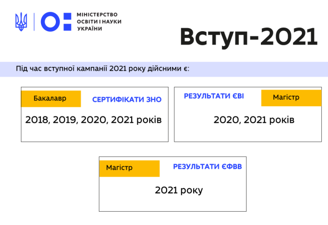 Від вступників до магістратури прийматимуться результати єдиного вступного іспиту 2020 та 2021 років, результати єдиного фахового вступного випробування – тільки 2021 року.