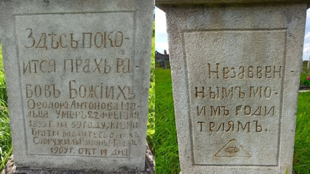 «На той час, щоб поставити такий монумент, потрібно було багато виділити коштів. Звичайні селяни, кріпаки, таке собі дозволити не могли. Це свідчить про те, що людина, найімовірніше, могла належати до різних організацій, в тому числі й масонських, які у XIX столітті були досить поширені», – сказав Юрій Велінець.Він додав, що важливість похованої тут людини для села будуть згодом досліджувати за допомогою архівних записів у Києві або в Житомирі. На двох боках пам’ятника є напис, присвячений Оеодору та Єлені Антоновим-Мальцевим, яких не стало у 1893 році. Масонський знак розміщений на іншому боці надгробка.