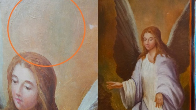 Ангел намальований на тонкій деревоволокнистій плиті, під якою наклеєно грубе полотно, повністю зафарбоване темно-зеленою фарбою. Як додав історик, під дошкою потенційно могло бути зображення, але на його думку, найімовірніше, воно не збереглося.