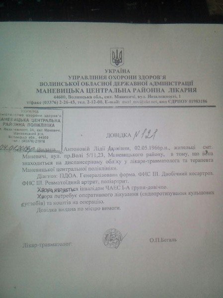 Жителька Маневич Лідія Антонова, яка є інвалідом I-ї групи, терміново потребує коштів на операції, після яких вона зможе ходити та бачити. Необхідна сума становить 107 тисяч гривень.