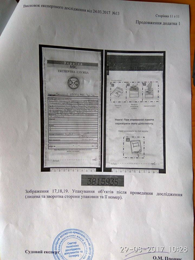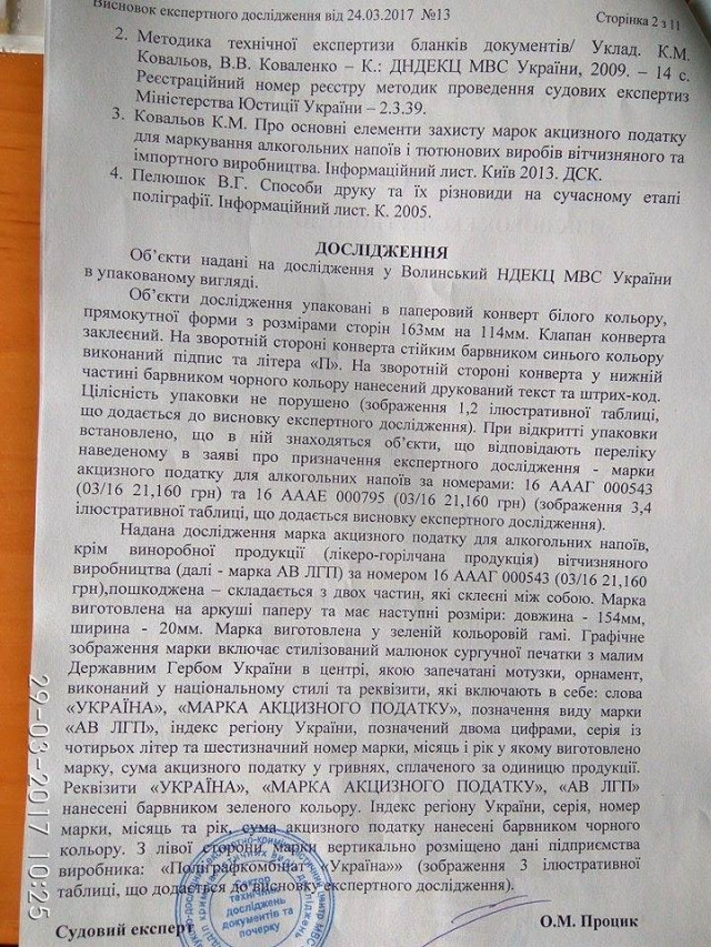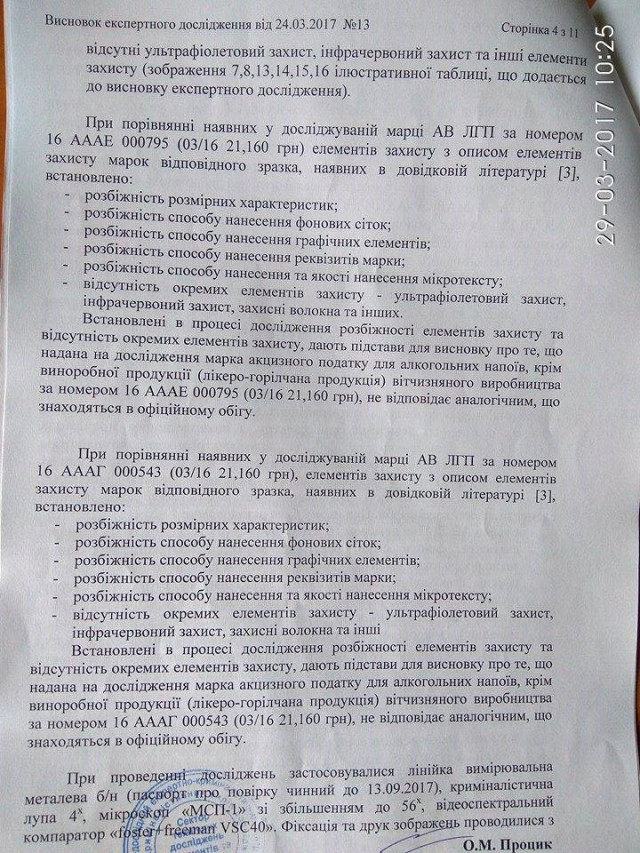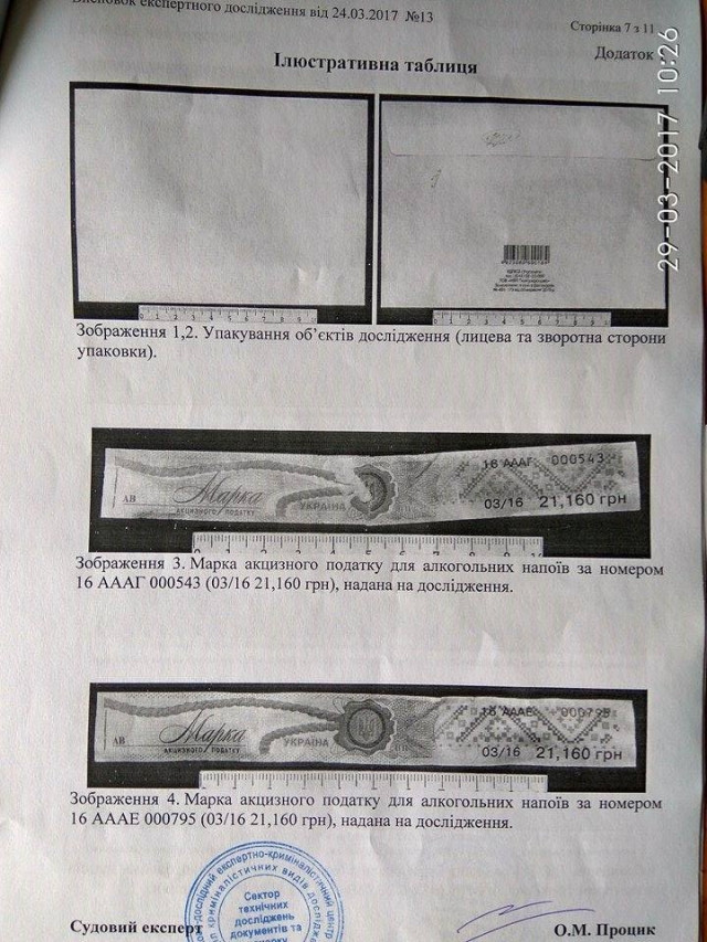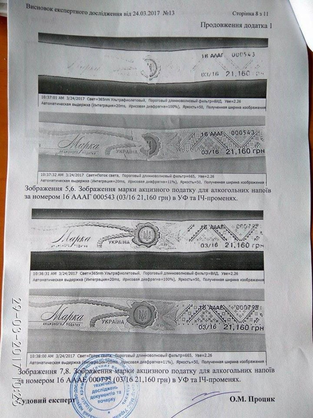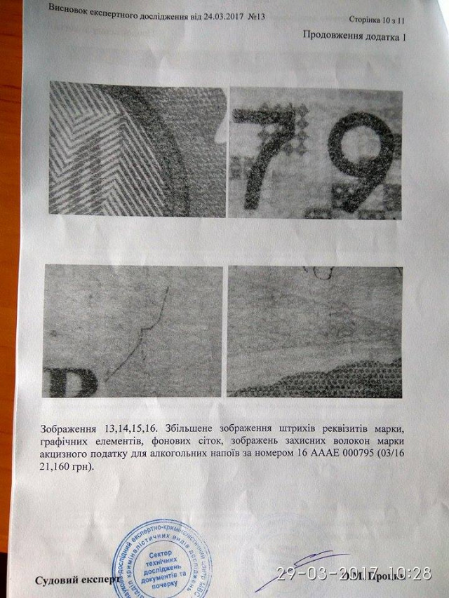 «Марки не відповідають аналогічним, які знаходяться в офіційному обігу. Є низка розбіжностей в елементах захисту», – однозначно заявив завідувач сектору технічного дослідження документів та почерку НДЕКЦ Олександр Процик.