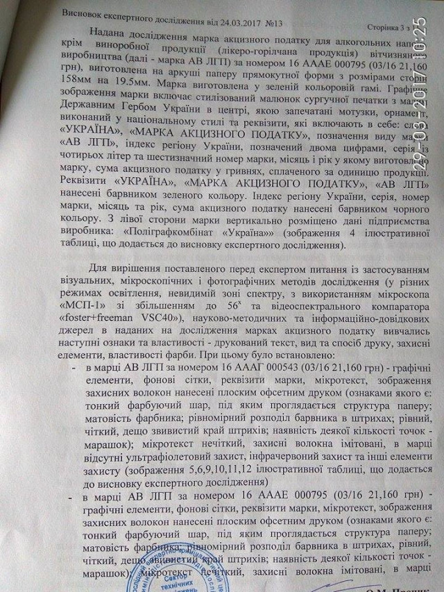 Висновок Державного науково-дослідного експертно-криміналістичного центру щодо оригінальності марок акцизного податку для алкогольних напоїв, які журналісти «Аверсу» придбали у магазині «Гроно»: