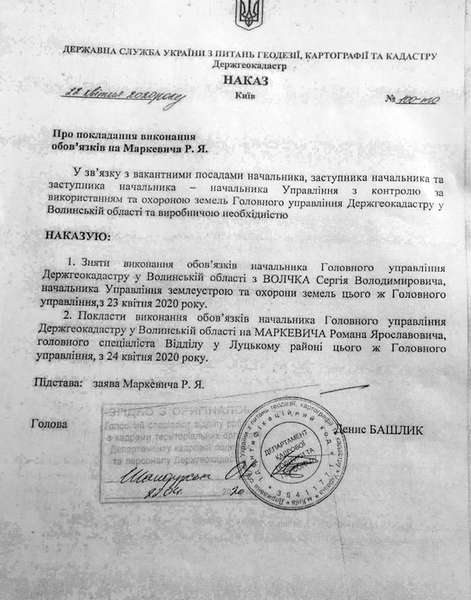Відповідний наказ, копія якого потрапила в розпорядження t1.ua, 22 квітня підписав голова Держгеокадастру України Денис Башлик.
