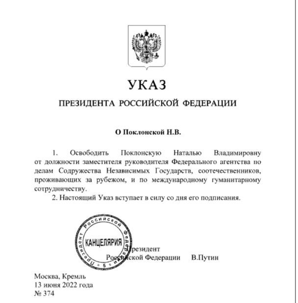«Звільнити Поклонську Наталію Володимирівну з посади заступника керівника Федерального агентства у справах Співдружності Незалежних Держав, співвітчизників, які проживають за кордоном, та міжнародного гуманітарного співробітництва», – сказано в документі.Сама Поклонська повідомила, що указ про її відставку з посади заступника голови Росспівробітництва був підписаний у зв’язку з її переходом на іншу роботу.