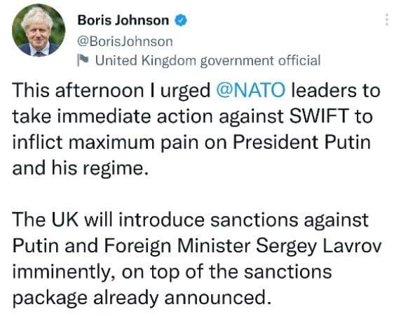 Велика Британія також вводить санкції проти президента РФ Путіна та голови російського МЗС Лаврова, повідомив премʼєр Борис Джонсон. Також він закликав лідерів країн НАТО вжити негайних заходів щодо SWIFT, щоб завдати максимального болю президенту Путіну та його режиму.