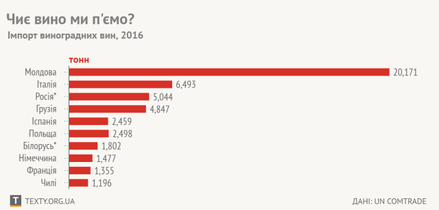 За ціною найбільше ми імпортували вина з Італії, але тут, з огляду на дуже різні ціни (італійське вино майже вдесятеро дорожче за молдовське), все ж має сенс порахувати в тоннах.