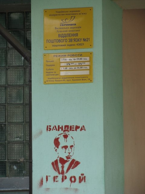 Невідомі розмалювали стіни будівель у Луцьку зображеннями Степана Бандери. Окрім того, на кальках зроблені надписи «Бандера герой».