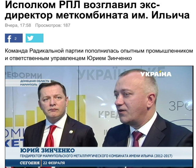 Виконавчий комітет Радикальної партії Олега Ляшка очолив "ахметовський кадр", топ-менеджер "Метінвесту" і колишній директор маріупольського меткомбінату ім. Ілліча Юрій Зінченко, який підписував меморандум з бойовиками.
