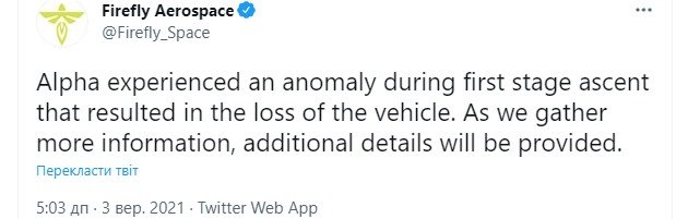 «На першому етапі підйому Alpha сталася аномалія, яка призвела до втрати носія. Протягом збору інформації будуть надані додаткові відомості», – повідомили в компанії.