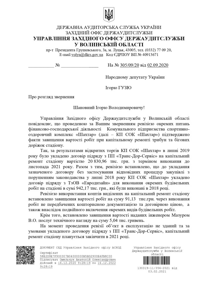 Як зазначається, на вимогу народного депутата Управління Західного офісу Держаудитслужби в області здійснило ревізію та виявило факти завищення вартості робіт під час капремонту трибун та бігових доріжок стадіону «Шахтар» у Нововолинську.