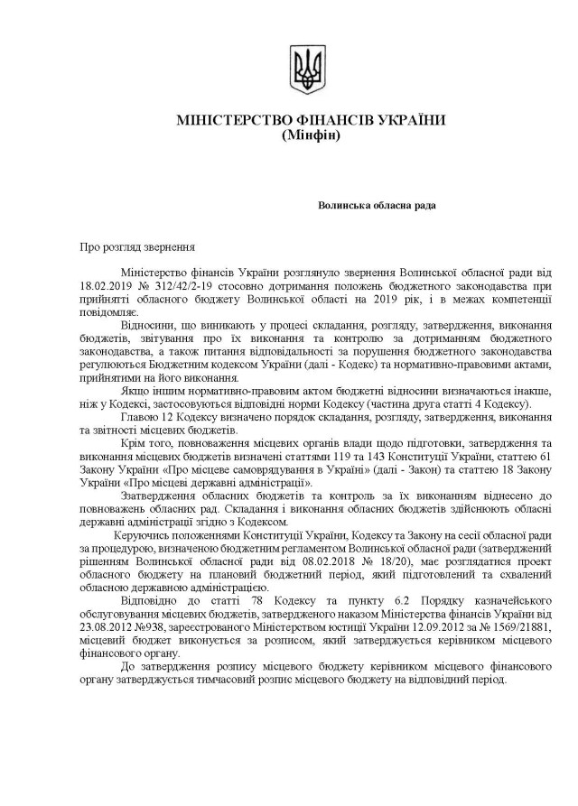 Міністерство фінансів України визнало законність дій Волинської обласної ради при прийнятті рішення про обласний бюджет та підтвердило правильність дій головної представницької влади області.