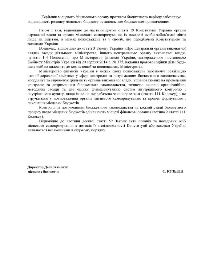 Посилаючись на українське законодавство, в Мінфіні нагадують, що до повноважень рад належить затвердження та контроль за виконанням обласного бюджету, а в компетенції ОДА – складання та виконання. Також в Мінфіні пишуть, що місцевий бюджет виконується за розписом, затвердженим керівником місцевого фінансового органу.