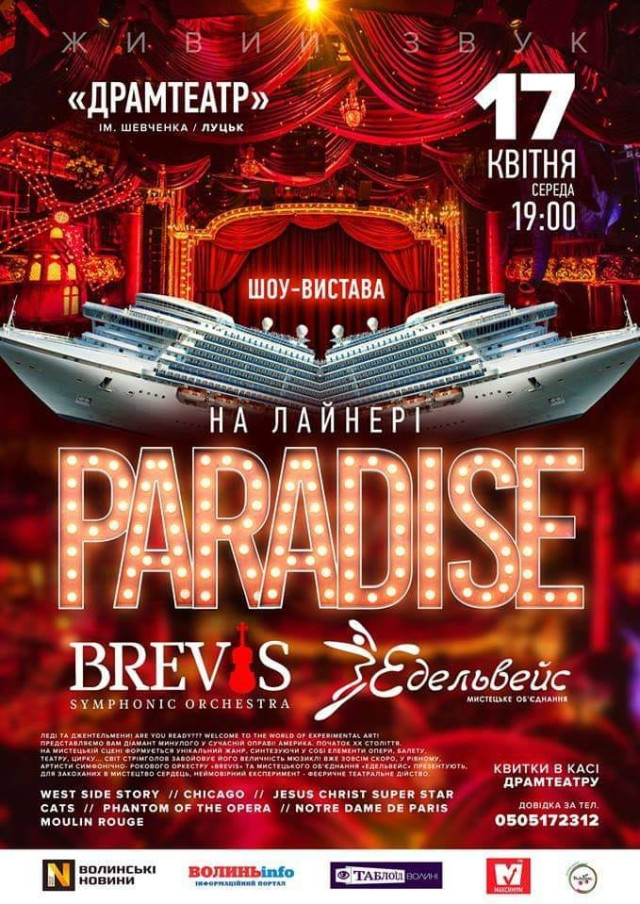 Шоу-вистава «На лайнері Paradise» відбудеться 17 квітня о 19:00 у Волинському обласному академічному музично-драматичному театрі імені Т. Г. Шевченка.