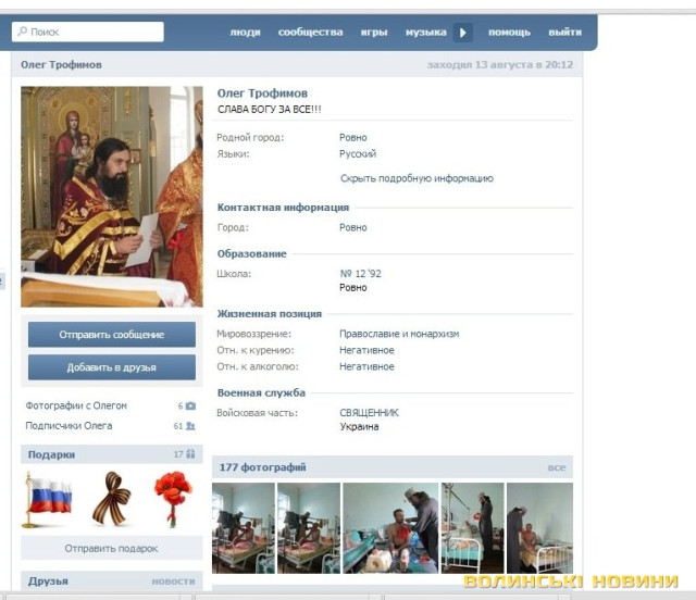 Однак, є й доволі цікаві персонажі. Зокрема, один з користувачів – священик з Рівного, який сповідає і причащає «героїв-ополченців» у лікарні. Не скупиться він викладати і фото цього процесу. Як вдалося з'ясувати, опальний протоієрей Олег Трофимов - реальна людина, він уродженець Рівненщини, і вже не один раз він фігурував у скандалах. Своїх земляків, які нині захищають землю від окупантів, він іменує не інакше як «фашисти» і не раз з'являється в полі зору преси.