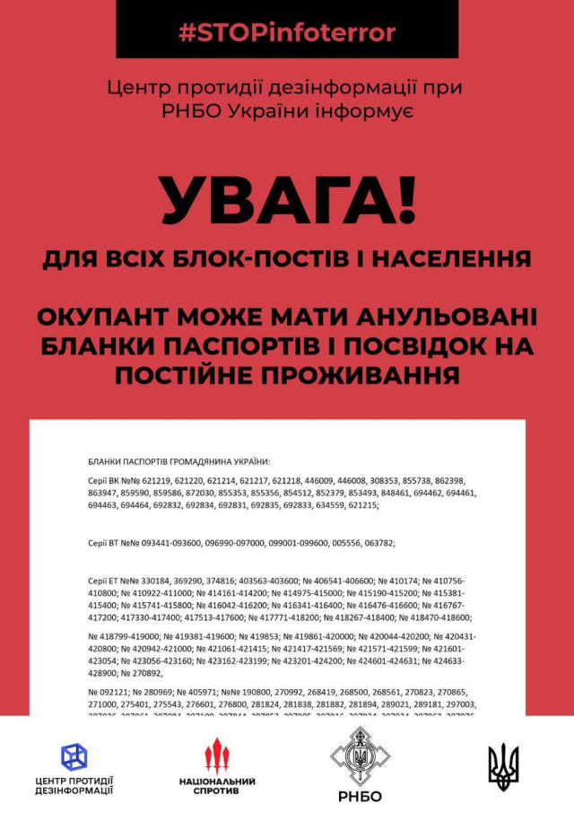 «Просимо бути уважними! Наводимо файл, в якому зазначено перелік недійсних (анульованих) бланків паспортів громадянина України, посвідок на постійне проживання, посвідок на тимчасове проживання, які визнані недійсними Державною міграційною службою України! Будьте уважні! Передавайте інформацію на блокпости для уникнення непорозумінь!» – йдеться у повідомленні.