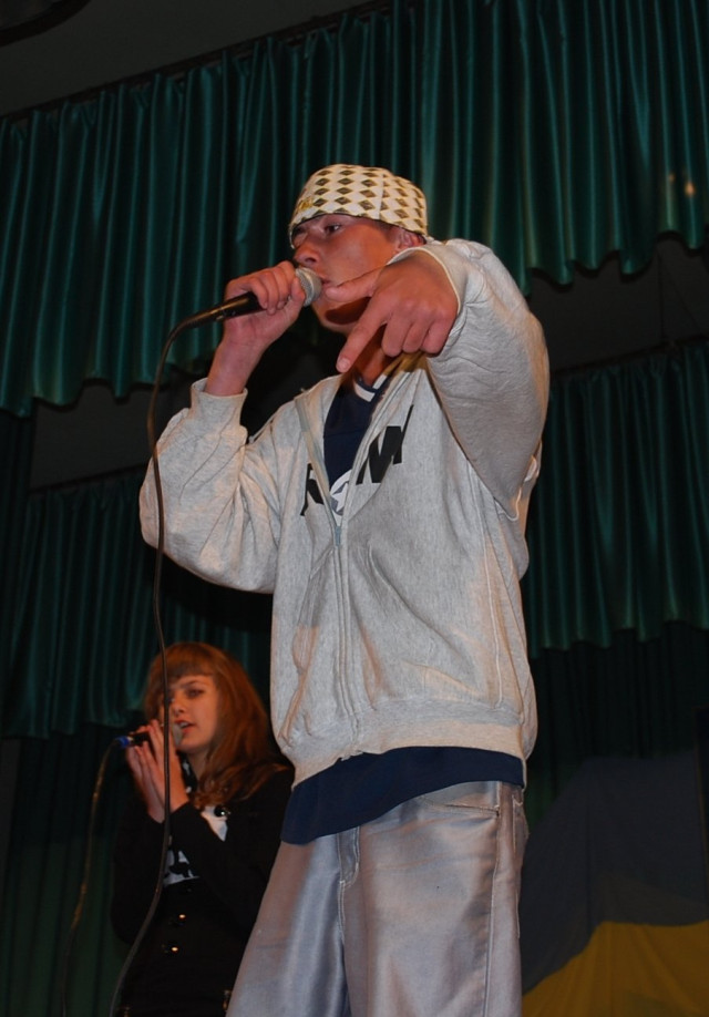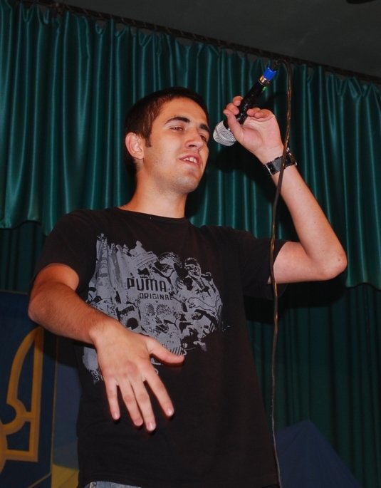 Олександр Захарчук – учасник місцевого гурту Variostyle, проте на конкурсі у нього – сольний виступ. Глядачі слухають «рожищенський реп». Йоу.