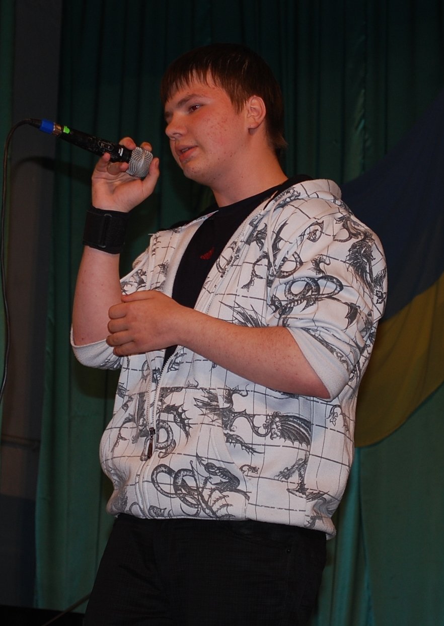 Олександр Захарчук – учасник місцевого гурту Variostyle, проте на конкурсі у нього – сольний виступ. Глядачі слухають «рожищенський реп». Йоу.