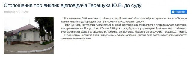 Слухання справи щодо розлучення доньки експрокурора Волині Галини Терещук з її чоловіком, заступником начальника Волинської митниці ДФС Юрієм Терещуком не відбулось, адже ні сторони, ні їх представники не з’явились на слухання, яке було заплановане в Любомльському районному суді 27 січня.