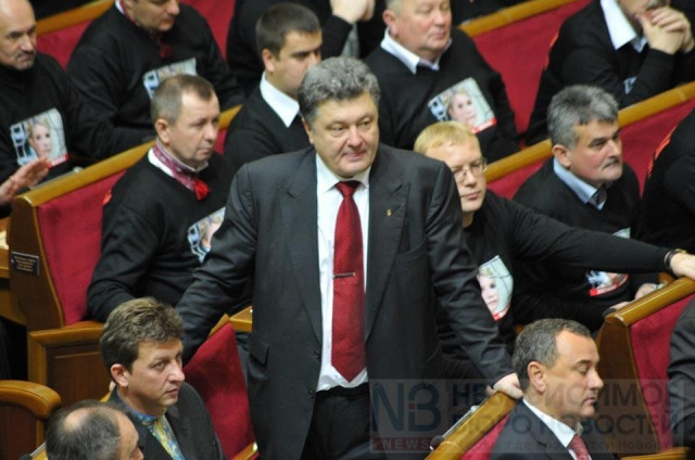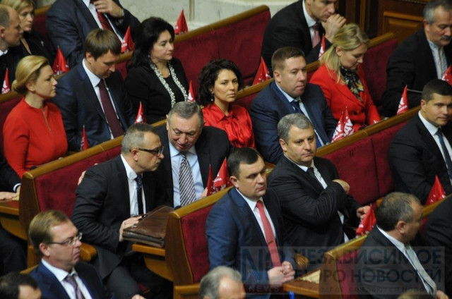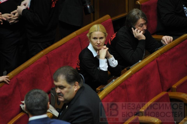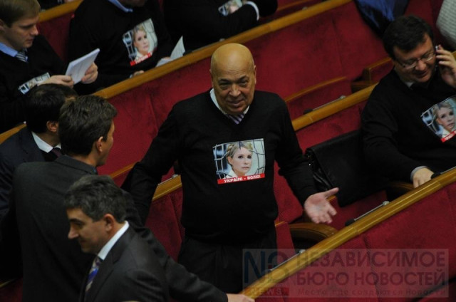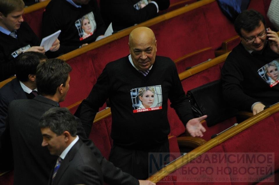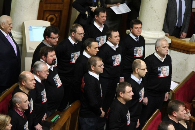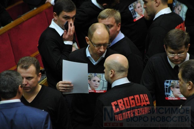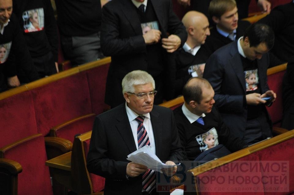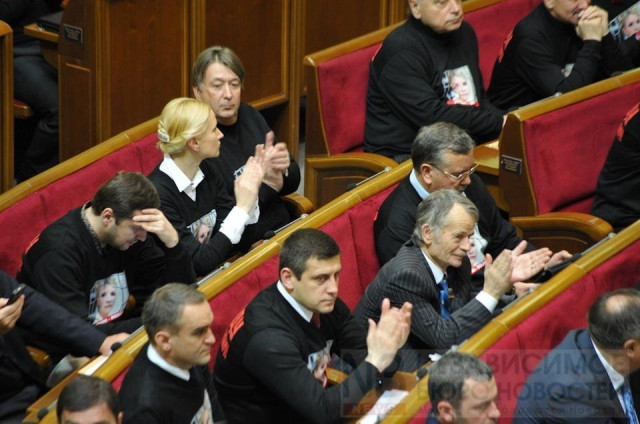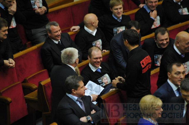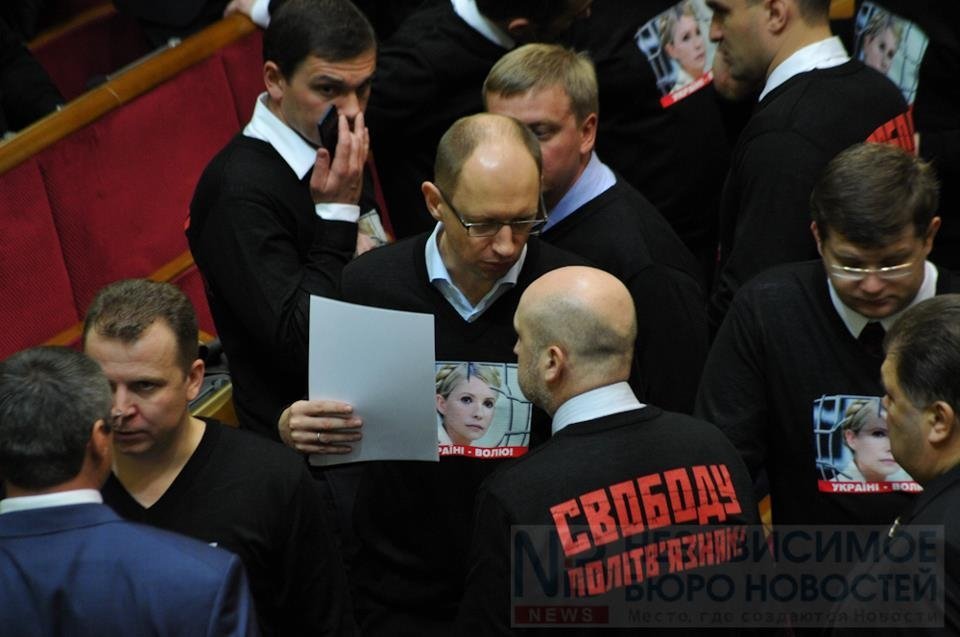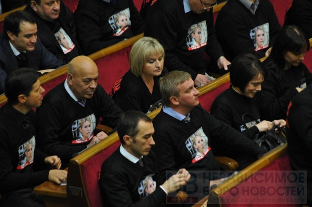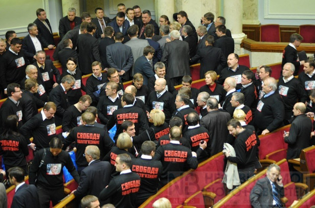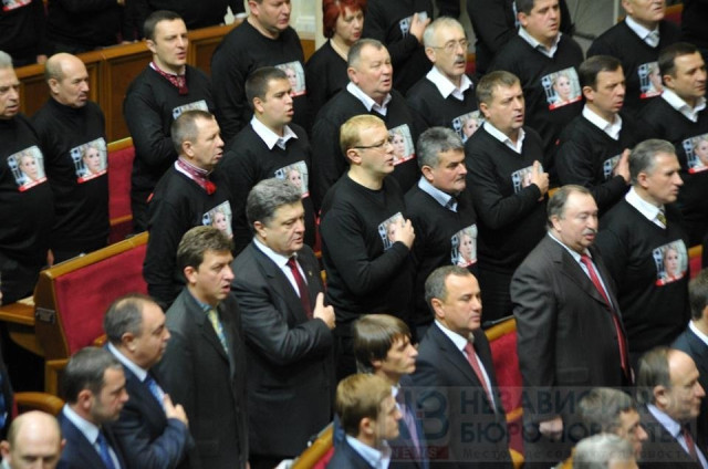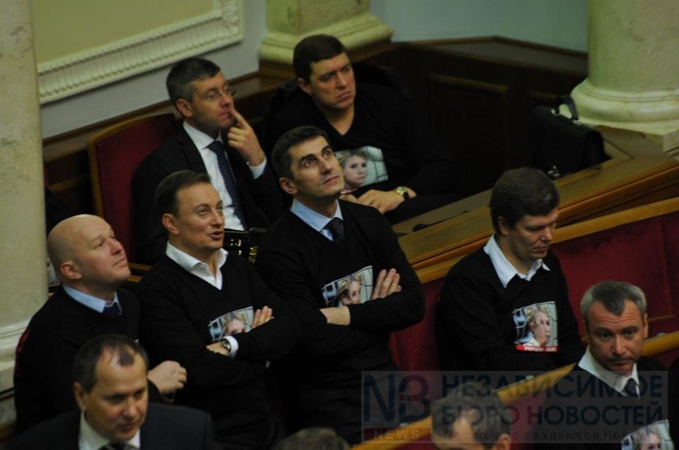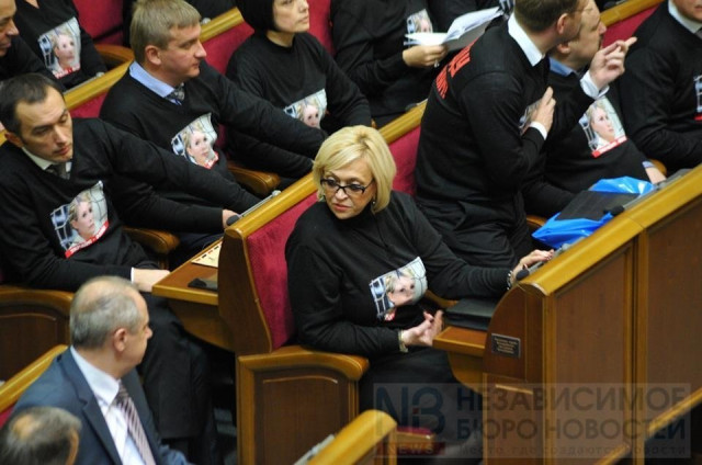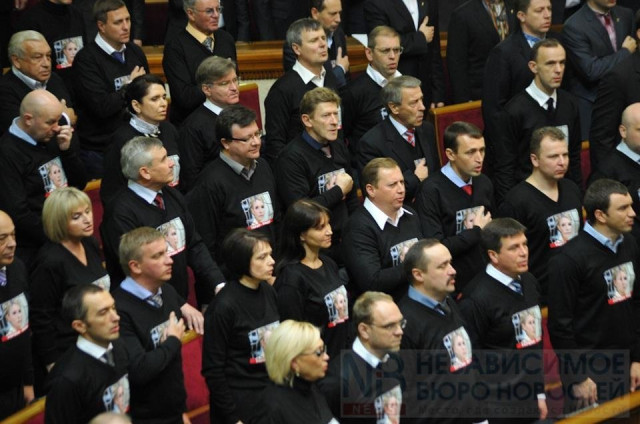 Народні депутати з Об’єднаної опозиції «Батьківщина» прийшли на засідання в чорних футболках, де на грудях ‒ портрет Юлії Тимошенко за ґратами, а на спині напис: «Свободу політв’язням».