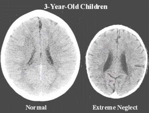 Американські неврологи продемонстрували вражаючу різницю між знімками мозку двох 3-річних дітей, яким їхні матері приділяли різну кількість уваги.