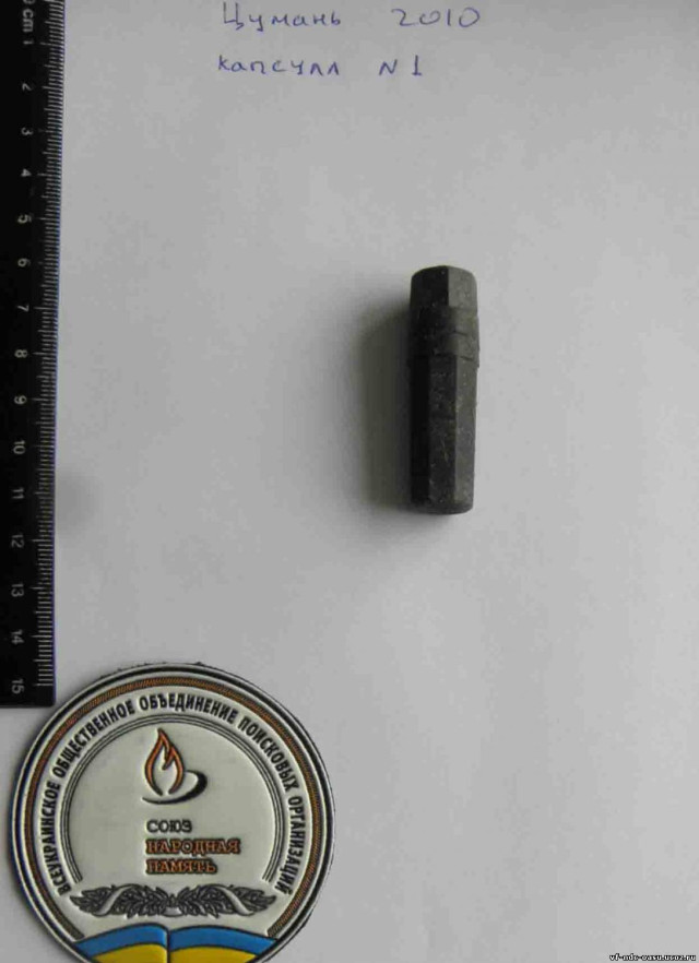 Передали також ебонітові капсули - особисті медальйони, яких було виявлено шість. У них під час Великої Вітчизняної війни вкладали подвійний аркуш з повною інформацією про бійця: ім'я, рік народження, рід військ. Про них, як атрибут "спорядження", згадує у романі "День Шостий" український класик Павло Загребельний: "... особистий медальйон - чорний пластмасовий циліндрик із щільною закруткою, а в нім - туго скручений папірець, на якому написано твоє прізвище, ім'я і по-батькові, домашня адреса, номер частини - візитна картка солдата на випадок смерті - для розпізнання і для вічності. Досі Козак не думав про власну смерть, смерть існувала тільки для когось невідомого, але не для тебе, ніколи для тебе, бо хіба не досить самого страху смерті, тепер же, коли враз задубілими й неслухняними пальцями невміло запихав той чорний циліндрик в тісну кишеньку на поясі штанів, спеціально вшиту для цього медальйона смерті, передбачену заздалегідь чиїмсь точним і холодним розумом, Веніамін, може, уперше за всі дні війни (такі ще недовгі і водночас такі нестерпно, нелюдськи тяжкі) вжахнувся від думки про власну загибель і щось здригнулося в ньому дитяче й скімливе..."