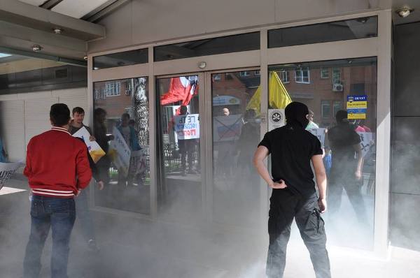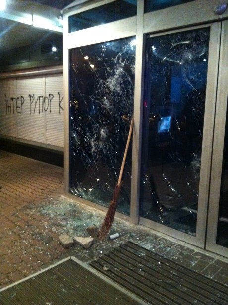 Нагадаємо, вчора на офіс телеканалу "Інтер" напали близько 20 чоловік в масках. Вони закидали офіс цеглою і камінням, розбили скло вхідних зони на першому поверсі.